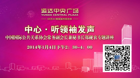 本次讲座由运达中央广场发起和主办,美丽人生、博胜互动、天橙广告、新风行协办。讲座将于2014年1月4日在湖南长沙运达中央广场隆重举行,届时湖南众多区域公关理事、会员、长沙传播行业高级经理人、商业精英等都将汇聚运达,就企业和品牌相关问题进行探讨和交流。