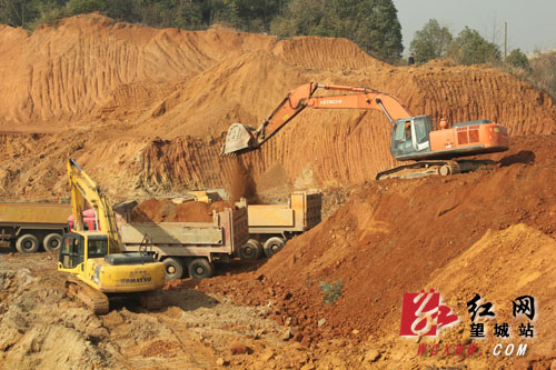 挖掘机和运输车辆在紧锣密鼓地施工。解巾英 摄