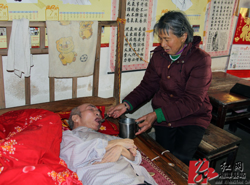 在排头乡辰山村井湾组,记者来到了黄桂英的家。家里摆设虽简陋,但却干净整洁。在一张老木床上,已经76岁的颜家福躺在床上,身体不能动弹,但精神面貌较好。妻子黄桂英正在给丈夫洗脸擦身,喂他喝温水,偶尔帮他擦擦嘴角,捏捏手臂。“我是1963年嫁过来的,当时17岁,就跟着他了。”如今的黄桂英已是60多岁的老人了,十分清瘦,白发苍苍,从老人的言谈举止间看得出老人的善良、能干。