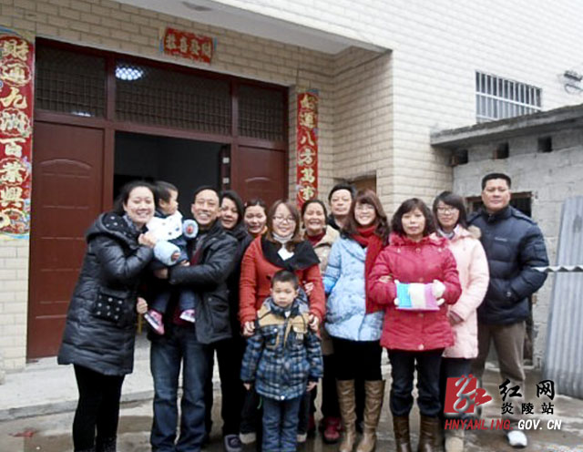 去年春节,老郭一家人与亲戚合影。穿红衣服者(前面站一小孩)为小娟;旁边穿蓝衣服者是小巧。