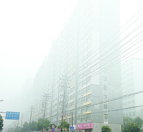 大雾中,若隐若现的高楼大厦。 记者范向辉昨天下午3点半摄于旭园路