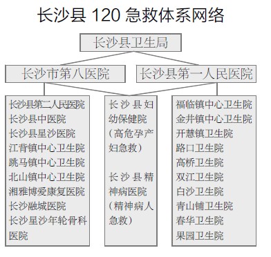 长沙县的急救网络体系建立于2007年9月,之前仅设有长沙市第八医院1个急救中心;另设长沙县第一人民医院、长沙县第二人民医院、长沙县中医院、长沙县妇幼保健院等4个急救分站;江背镇、跳马镇、福临镇、北山镇、金井镇中心卫生院等7个急救点;共配置23台急救车辆。在接到市民拨打的120急救电话后,设立在长沙市第八医院的120急救中心会根据市民所在位置联系就近的急救分站或者急救点出警救援。