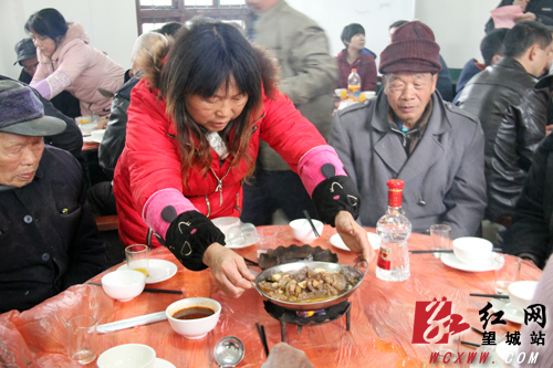 早几天就接到邀请的五保户老人们早早的就来到了村部。在孝心村村部临时布置的食堂内烧起了温暖的炭火,6张大桌子已经整整齐齐的摆好,老人们坐在一起开开心心地拉起了家常。厨房里,志愿者和村民们正在忙着炒菜、乘菜,为了能让大家吃上一顿可口、热闹的“腊八饭”,大家已经准备了一个上午。