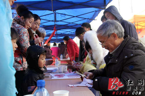台下一侧,望城书法名家泼墨挥毫,将一幅幅吉祥喜庆的春联送给群众;传承望城精粹的“剪神”秦石蛟手拿剪刀熟练的剪出一幅幅生肖、人物,受到群众的青睐。另一侧,在“三下乡”服务台前,科技特派员和律师正在认真细致的接受群众咨询;在望城区卫生局组织的义诊区,群众纷纷上前请名老中医给自己的健康把把脉。