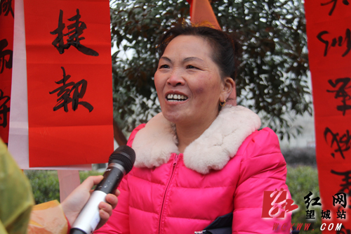拿到大师写的春联,她高兴的告诉记者,要把春联贴在家门口,希望祖国繁荣富强,家庭和睦,万事如意。(刘赛 摄)