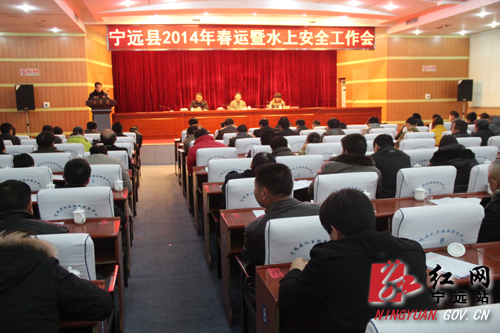 红网宁远站1月14日讯(通讯员 陈国宏)1月13日下午,宁远县在县政务中心102会议室召开2014年春运暨水上交通安全工作会议。县委副书记蒋良铁、副县长刘惠兰、县政府副调研员杨桐春出席会议。17个乡镇的乡镇长和分管春运工作的领导,县春运领导小组各成员单位负责人,春运办和城市客运专项整治组工作人员,交通运输、交管、物价有关股室负责人,运管所全体工作人员,长、短途站场负责人,长、中、短途客运线路负责人及公交车、出租车公司代表共200余人参加会议。