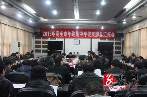 红网双牌站1月15日讯(通讯员:唐娟) 1月13日,永州市政府督查室主任蒋爱新及考核组一行莅临双牌县检查指导年终集中考核工作,检查组通过深入项目建设现场、企业,查看资料台账,召开座谈会等形式对我县2013年的绩效评估、为民办实事、新型工业化、十百千工程、开放型经济、农业农村工作、旅游、党风廉政建设责任制、党管武装等工作进行集中考核。并在县政府会议室召开2013年度全市年终集中考核工作汇报会。