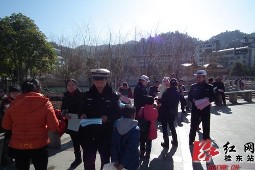 春运首日,桂东县交警大队民警还在县城罗宵广场,采用摆放展板、发放宣传资料、接受现场咨询等方式,大力开展春运道路交通安全宣传工作。