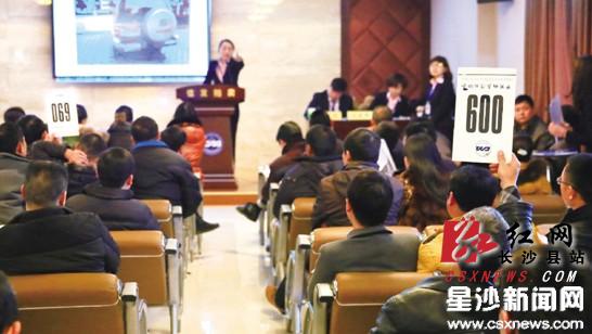 在长沙信发拍卖有限公司超编公务车竞拍现场,竞标者争相举牌竞拍一辆长丰猎豹SUV。刘晓东摄
