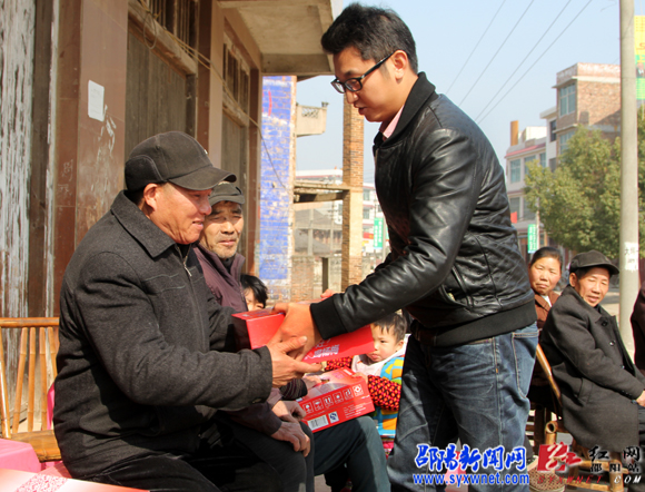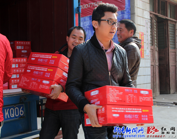 红网邵阳站1月20日讯(分站记者 李慧兰)1月19日上午,邵东县流泽镇新泉村,70多岁的老邓接过一箱杨梅汁后,高兴地握着邓文艺的手说:“你真是个好人,每年给我们送好几次饮料。”