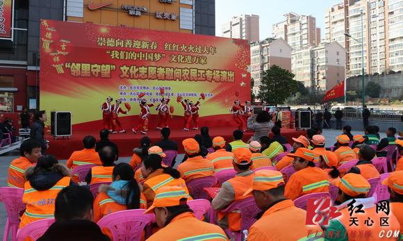 红网天心站1月22日讯(通讯员 杨威 徐拓)1月22日,在天心区井湾子社区大润发超市前坪,锣鼓喧天,歌舞齐鸣,“我们的中国梦”文化进万家——“邻里守望”文化志愿者慰问农民工专场演出”在此火热上演。来自天心区群众文艺团队的文化志愿者们为现场市政、建筑、环卫、园林等行业500多名农民工奉献了一场冬日里的“文化盛宴”,市委宣传部副部长、市文明办主任郑力虎以及区委常委、宣传部长李曦等出席活动并观看演出。