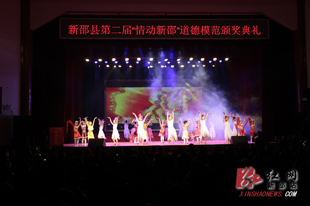 颁奖流程共分孝老爱亲、助人为乐、诚实守信和见义勇为、敬业奉献四节。随着主持人动情的解说和短片的播放,道德模范的形象立体式地凸显在现场每一名观众面前,触动了在场每一个观众心底最柔软的部分。本届情动新邵道德模范评选活动从2013年5月开展以来,在大量的好人好事中共评出了孝老爱亲的好母亲王子平、不畏艰辛孝敬残疾父母的13岁好儿郎谢前进、好媳妇李冬凤、助人为乐的献血冠军黄日强、义务疏导员卢群娥、诚实守信扎根乡村的教师王丽花、见义勇为的黄酝酿、敬业奉献的李建华、调解能手唐亮满、山区好税官魏华武等10名道德模范。在颁奖过程中,还安排了“美丽中国”、“感动”、“幸福山歌”、“热血浓情”、“好人就在身边”、“党旗颂”等歌舞节目。寒梅展芳华,朵朵报春来。颁奖典礼是短暂的,但道德模范为社会提供的正能量是长久的,他们会导引我们在培育和践行社会主义核心价值观,建设“四个新邵”的征程上更快地前行。