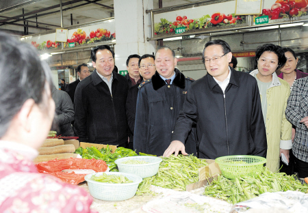 岳麓区格林星城生鲜市场地处6个居民小区的核心部位,辐射供应周边6万多人。走进市场,易炼红一个一个摊位详细询问购销交易和价格等情况。经营户老张卖的都是自家产出的本地菜,他告诉易炼红,前段时间因为河西高校放假,需求量有所减少,菜价有小幅下跌,但随着春节临近,价格正在稳步攀升,自己也小赚了一笔。易炼红祝老张生意兴隆,并叮嘱一旁的市场管理部门负责人,务必要保证蔬菜和生鲜副食品等的质量,严厉打击“黑心秤”短斤少两的行为。同时,要及时监控价格波动情况,既要兼顾生产者、经营者、消费者三者利益,又要防止出现哄抬物价的情况,切实保证市民基本生活必需品的供应。