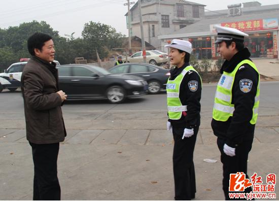 在S204公路线上,车辆如织,邓宗祥来到公安干警值勤点,看望慰问正在路上值勤的交警及特警们,与他们一一握手致意,感谢他们站在寒风中坚守工作岗位,为人民群众的安全出行保驾护航。邓宗祥要求,公安交警要时刻把握车辆的通行状况,确保S204线安全畅通,同时嘱咐干警们在维护道路秩序的同时,注意自身安全。