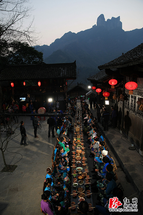 这天下午,村支书杨金风家的石板院坪上用门板摆起了“一”字型100余米的长桌,各家各户把自备的好菜、好酒,摆在长桌上,品种丰富,视觉、嗅觉、味觉样样齐全,争奇斗艳。开饭是由苗寨德高望重的寨老喊动筷子,然后不分男女老少大碗喝酒,大块吃肉,大声欢笑……吸引了许多附近村寨群众和外来的游客参加“百家宴”。