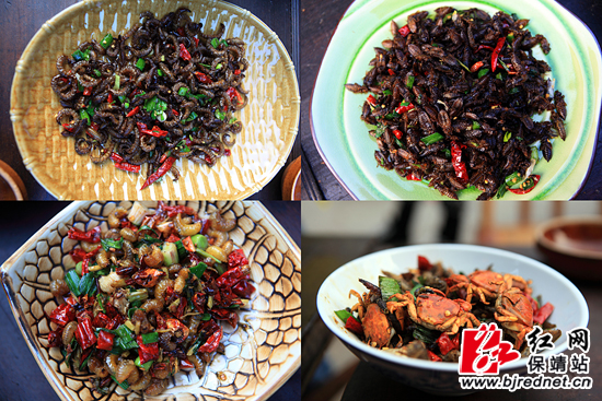 以蜈蚣虫、桃花虫、蜻蜓蛹、螃蟹为食材做成的虫子宴。