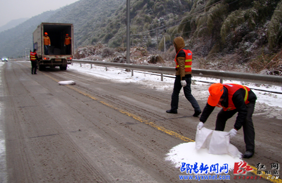新邵县公路管理局抗冰保畅人员与当地政府工作人员在G207线梅寨坳地段清除积雪。