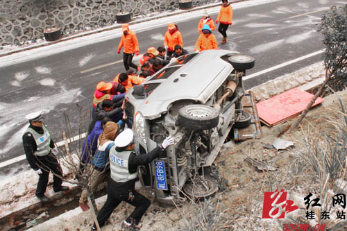 红网桂东站2月11日讯(通讯员 邓仁湘)连日来的阴雨低温,造成桂东县多条道路结冰。2月10日,一客运面包车因道路结冰路滑,侧翻于国道106桂东县增口乡长脚垅段。闻讯后,县交警和公路局应急队火速奔赴现场,和热心群众合力救援。