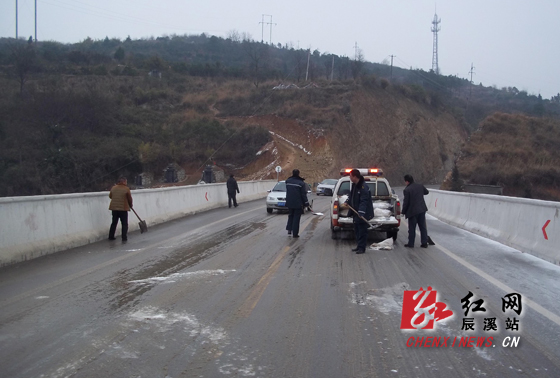 截至目前,道路积雪基本清除融化,无交通安全事故发生。此次降雪使积雪普遍厚达3厘米左右,部分地段达5厘米以上,辰溪公路局共投入抗冰设备7台套、铲冰、撒盐38人次,用盐近8吨。并健全了冰冻时期抗冰保畅长效机制,充分做好了抗冰保畅的准备工作,力保我县干线公路冰灾期间的安全畅通。