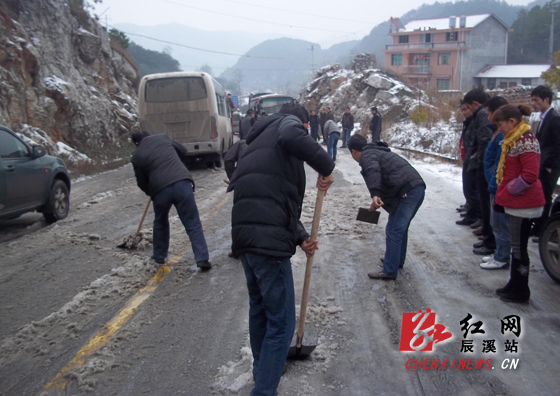 红网辰溪站2月11日讯(通讯员 李代云)2月8日,受冷空气影响,我县普降大雪,省道S223线界牌坳路段、S308线潭湾新桥等地段发生路面结冰,车辆通行受阻,辰溪县公路管理局立即启动抗冰应急预案,组织全局干部职工兵分三路到现场开展抗冰救灾保畅通工作。