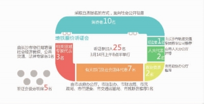 地铁票价听证会将在3月14日上午8点半举行,本次听证会共设听证参加人25名。其中消费者10名,采取自愿报名的方式,面向社会公开征集;经营者1名,由长沙市轨道交通集团有限公司推荐;人大代表2名,由市人大办公厅推荐;政协委员2名,由市政协办公厅推荐;有关部门及社会团体代表7名,由市政府办公厅、市法制办、市财政局、市民政局、市住建委、市交通运输局、市残联各推荐1名;相关领域专家代表3名,由长沙市物价局聘请社会经济管理、公共交通、法律专家各1名。另外,听证会设旁听席5名,报名结束后,按照报名先后顺序确定,额满为止。
