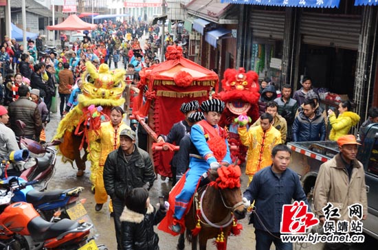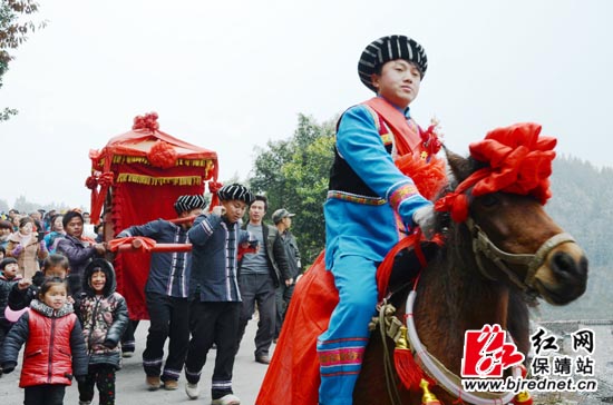 红网保靖站2月13日讯(通讯员 向万银)2月10日乃农历正月十一,保靖葫芦街道上唢呐声声,锣鼓喧天,苗族青年石建鹏骑马坐轿娶新娘传统习俗婚礼活动在这里举行,吸引了千余群众眼球。