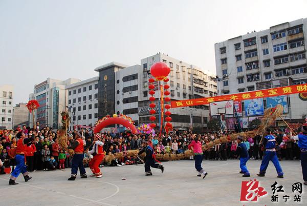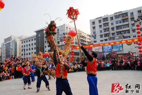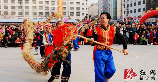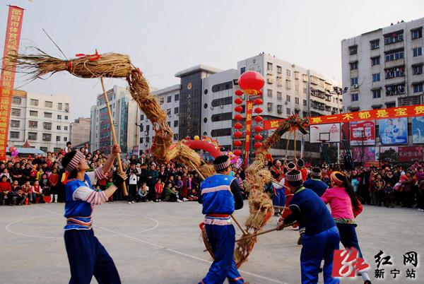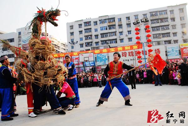 红网新宁站2月14日讯(通讯员 杨坚)新宁草靶灯是传统的龙灯,用优质的稻草和纤细的竹片制作,显得古朴而富有民族特色。每年春节、元宵节,新宁民间一些百姓都要扎上草靶灯,挨家挨户登门拜年,送上喜庆。舞龙者由十余人组成。1人在前用绣球斗龙,其余全部举龙,表演“二龙戏珠”、“双龙出水”、“火龙腾飞”、“蟠龙闹海”等动作 。