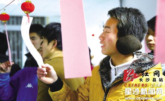 12日,湘绣苑小区元宵节送汤圆猜灯谜活动,吸引了许多住在小区的产业工人参与,一居民正在猜灯谜。刘晓东摄