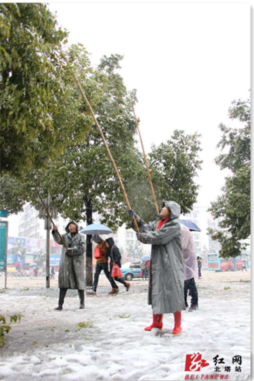 西湖桥东匝道人行道旁,区住建局干部职工身穿雨衣,拿着竹竿在为绿化树除雪“减压”。区住建局干部唐少辉告诉记者:“保护好每一棵树,是我们住建局的责任和义务,一上午我们都在为城区树木减除积雪,确保他们不被压断。”