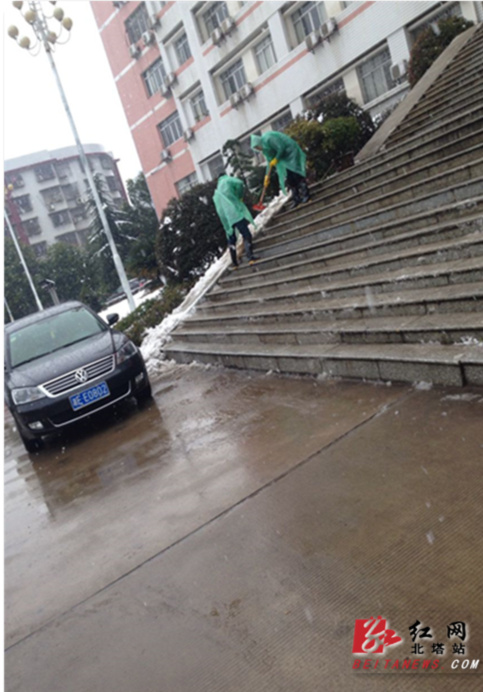 图:机关事务局的干部职工正在清除机关大楼门前的积雪