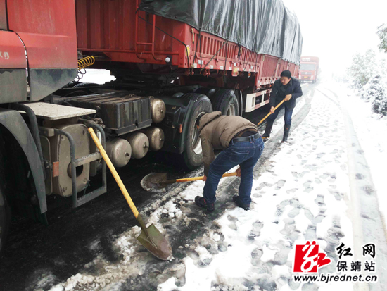 野竹坪镇安监站人员为困在路上的卡车除冰