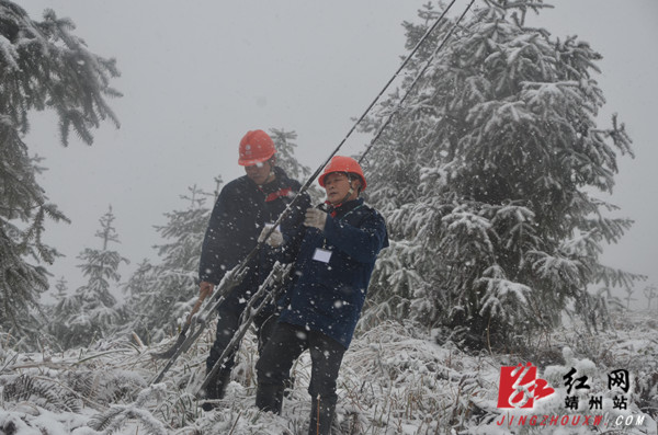 红网靖州站2月20讯(分站记者 陈俊名 通讯员 曾红梅 石云昌 )2月18日,靖州再次迎来大范围降雪,海拔高寒山区电线杆已出现覆冰情况。为应对雨雪冰冻天气对电网可能造成的影响,靖州电力公司输电运检班的工作人员,步行来到海拔700余米的太坪界山顶查看35千伏艮坳线的覆冰情况,及时排查险情,确保电网安全稳定运行。