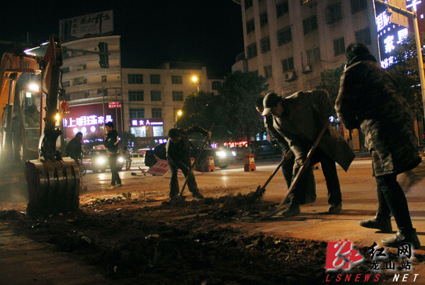 夜幕下,工人们正在清扫拆除的街道花坛的泥土,确保城市面貌干净整洁