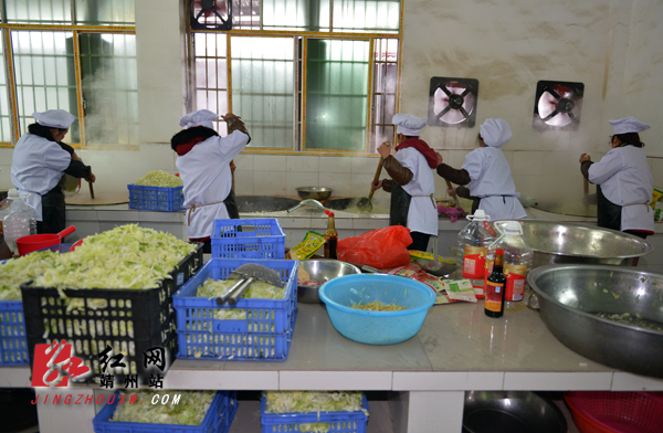 食堂大师傅在为每个班分菜 龙本亮 摄