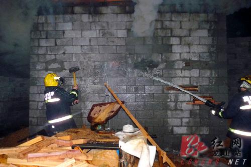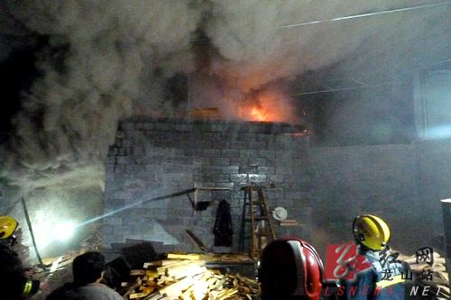 23时05分,大队官兵到达现场,经侦查和询问加工厂工作人员发现,起火部位为加工厂木材烘烤间,烘烤间内堆放有大量木材四周封闭只有一面有房门大小的出口,烘烤间内有大量浓烟冒出并时常闪现明火。在了解现场情况后,大队指挥员立即下令出一只水枪进行扑救,由于烘烤间内堆放大量木材,水无法打到着火部位。在征求加工厂老板同意后,大队官兵在出水控制火势的同时,对另外一面墙进行破拆,12时20分墙面破拆完毕,同时出2支水枪进行扑救,约20分后明火基本扑灭,随后,大队官兵将扑灭木材转移并用铁铤、火钩将现场处于阴燃的地方扒开,将火彻底打灭。02时45分许火灾被完全扑灭,所幸无人员伤亡。