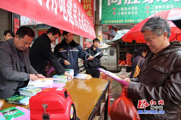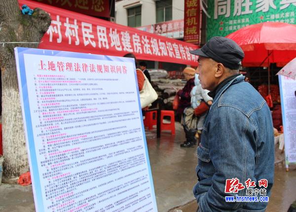 红网绥宁站2月28日讯(通讯员 向云峰 周泽宁)“在自己的责任田里未经比准,擅自搞建设是违法行为……”2月28日正逢绥宁县武阳镇赶集,县国土局、公路局、电力公司与武阳镇政府联合在镇上开展“农村村民用地建房法规知识宣传”活动。现场吸引了众多村民前来咨询农村用地建房的政策和法规。