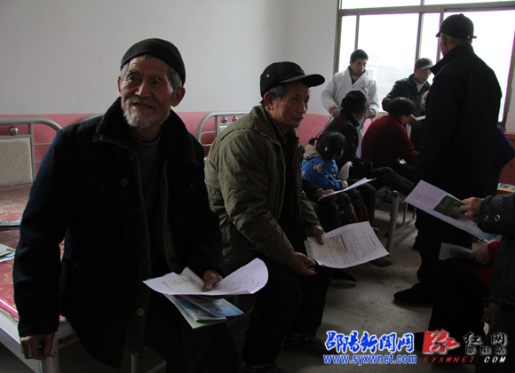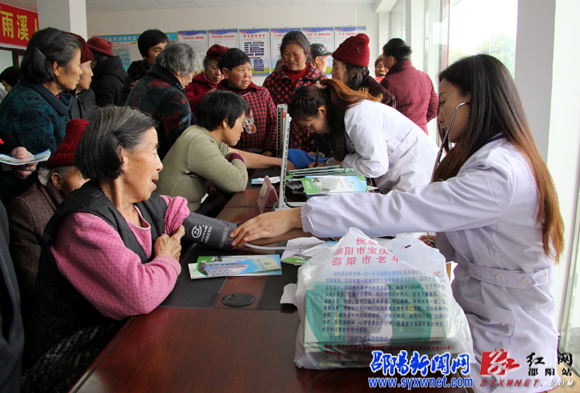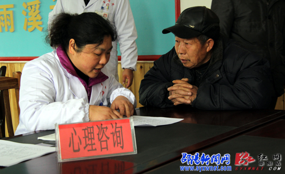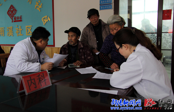 上午8点30分左右,大祥区雨溪镇雨溪社区居委会办公室已经聚集了不少群众。78岁的唐平中就是其中之一,他和大家一样,十分高兴,他说:“除非是生病了,我们才会去医院。平常,我们从来没有去医院体检过。这次,宝庆精神病院派医务人员来给我们免费看病,还免费送药,我们很高兴,谢谢他们。”