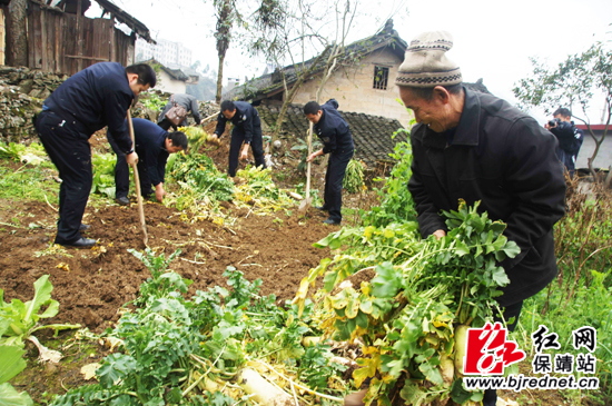 走入花井村78岁村民彭远明家中,低矮房屋与家中简陋家具让民警们感叹乡亲的艰苦。彭远明被列入村里的困难低保户,儿子患有精神疾病,长年服药,中队长张志国带领交警与老人亲切地拉起了家常,询问老人困难需求,并为老人送上米、油、面、水果等慰问品,得知老人家门前的一块菜土打算翻土耕种,高速交警与村干部们挽起衣袖裤腿,走入田土帮助拔萝卜,挖泥铲土,老人感受浓浓暖意,表示辛苦大家了。张志国表示这也是大家力所能及的事。