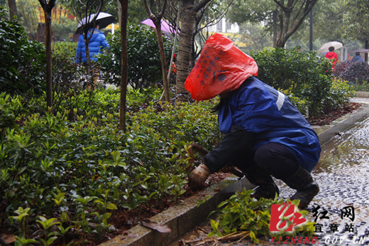 图为一位种植工人冒雨种植