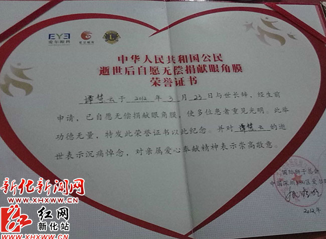 潘颖欣的妈妈谭慧云是新化县第一例眼角膜捐献者。两年前因患癌症去世,去世前自愿将眼角膜捐献给更需要的人,给患者带来光明。