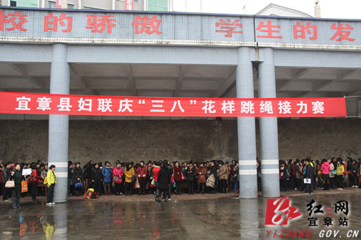 红网宜章站3月7日讯(分站记者 李云 实习记者 罗娟)3月6号上午,在湘粤学校操场上格外热闹,县妇联正在这里举行庆“三八”国际妇女节花样跳绳接力赛,只见场内选手跳绳翻飞、身影灵动,场外人们层层围住,助威观战。岩泉镇代表队最后摘得桂冠。