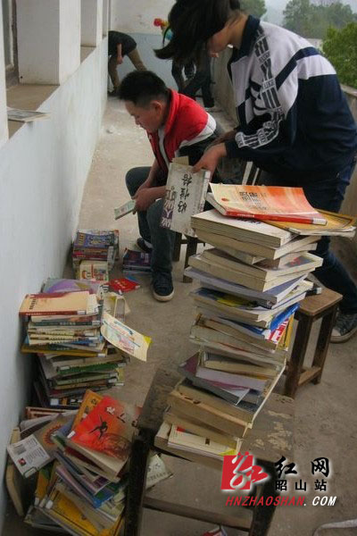 同学们在帮忙整理图书。