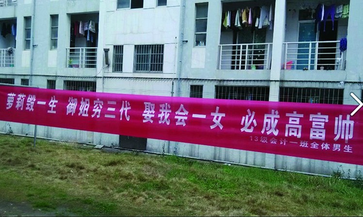 横幅标语千奇百怪,最霸气的横幅当数来自该校工商管理学院的“工管女神,烈火红唇,兰心蕙质,狂野销魂”;最亲切的莫过于国际贸易班的“好汉不提当年勇,如今只把你来宠”,“一生献给土建,今天献给女生”。