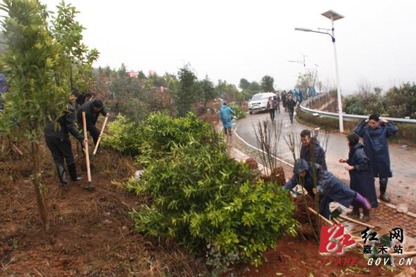 上午9时30分,春雨绵绵,寒意逼人。赵宇一行来到县九老峰景区植树现场,带头拿起铁锹,与干部职工一起,挥锹铲土、扶直树苗、培实新土、提桶浇水,每道工序都做得仔细认真。经过近两个小时的紧张劳动,共种植桂花、紫薇、红叶李、红叶石楠、碧桃等树木800多株,一排排新栽下的树木昂然挺立,展现出蓬勃生机。