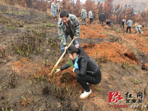 红网宜章站3月12日讯(分站记者 孙林林 通讯员 王碧英 谭小毛)阳春三月,春暖花开,又是植树好时节。3月11日上午,在一六镇政府的组织下,镇党委政府领导与镇直单位机关百名干部职工一起来到栏杆岭村山上,参加义务植树活动,用自己的双手种下种下一棵棵象征希望的树苗,为一六增添新绿。掀起了全镇“植树造林,绿化家园”活动的高潮。