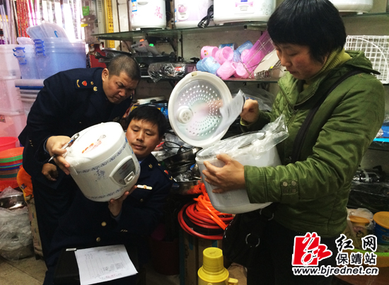 执法人员仔细查看家用小电器商品标识是否齐全