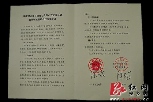 红网安乡站3月18日讯(分站记者 李蓉)为贯彻落实党的的十八届三中全会和中央1号文件精神,全面实施改革开放合作发展战略,日前,安乡县委书记宋云文带领县领导黄旭峰、林红华、王苠睿以及相关部门负责人一行7人,前往贵州省贵阳市,就农业产业化、新农村、物流园、商贸城等建设进行考察、学习,并于14日与贵阳市农业委员会签订了农业领域战略框架协议。
