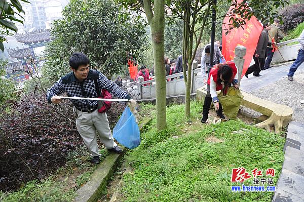 红网绥宁站3月18日讯(通讯员 黄生勇)3月18日上午,40多数面鲜红的志愿服务队队旗飘荡在绥宁县城满顶界植树纪念园、革命英雄纪念园。队旗下,500多志愿者在这里开展清理有色垃圾志愿服务活动。
