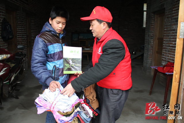 公益志愿者把衣物、书及爱心款送到13岁的贫困留守生何陵华手上