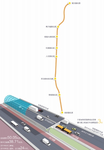 待快速公交和地铁5号线建成后,万家丽路将形成高架快速路、地面辅道、快速公交、地下轨交以及慢行交通为一体的复合型立体交通走廊。